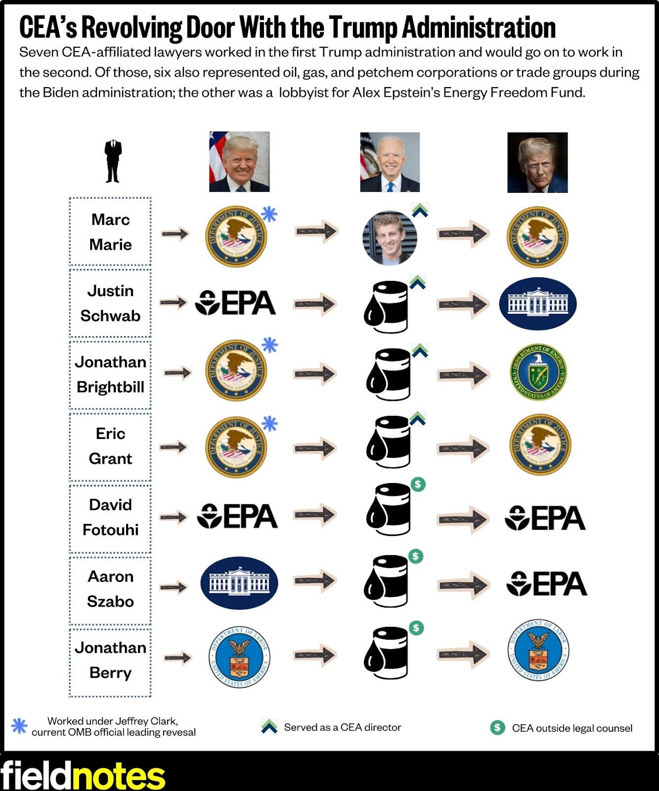 But this much is clear: Many of the lawyers who worked with, for, or alongside CEA before rejoining the current Trump administration last year were directly involved in the reversal, including U.S. EPA’s David Fotouhi and Aaron Szabo, DOE’s Jonathan Brightbill, CEQ’s Justin Schwab, and DOJ’s Marc Marie. And importantly, those same CEA-affiliated lawyers spent the Biden administration simultaneously representing oil, gas, and petrochemical interests via their outside work for specific companies, trade lobbies, and/or special interest groups.